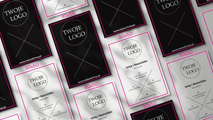 Standardowy projekt wizytówki – wymiary w Polsce to 90 × 50 mm lub 85 × 55 mm. Przy projektowaniu należy pamiętać o tzw. spadach oraz marginesach bezpieczeństwa (najczęściej 3 mm), które pozwalają uniknąć ucięcia istotnych elementów podczas cięcia papieru.